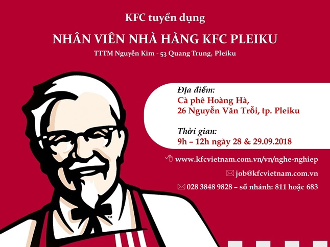 - Số lượng: 30 nhân viên - Địa điểm làm việc: KFC Nguyễn Kim Gia Lai - TTTM Nguyễn Kim, số 53 Quang Trung, phường Hội Thương, Pleiku - Thời gian làm việc: ca xoay theo ngày (phù hợp với sinh viên) - Mức lương cạnh tranh, con đường thăng tiến rõ rang, môi trường làm việc chuyên nghiệp PHỎNG VẤN TRỰC TIẾP - Địa điểm: Quán cà phê Hoàng Hà, số 26 Nguyễn Văn Trỗi, phường Hội Thương, thành phố Pleiku Thời gian phỏng vấn: - Thứ 6, ngày 28/09/2018: Từ 9h đến 12h - Thứ 7, ngày 29/09/2018: Từ 9h đến 12h Liên hệ: Anh Dũng – SĐT: 0976250268 ỨNG TUYỂN ONLINE: www.kfcvietnam.com.vn/vn/nghe-nghiep